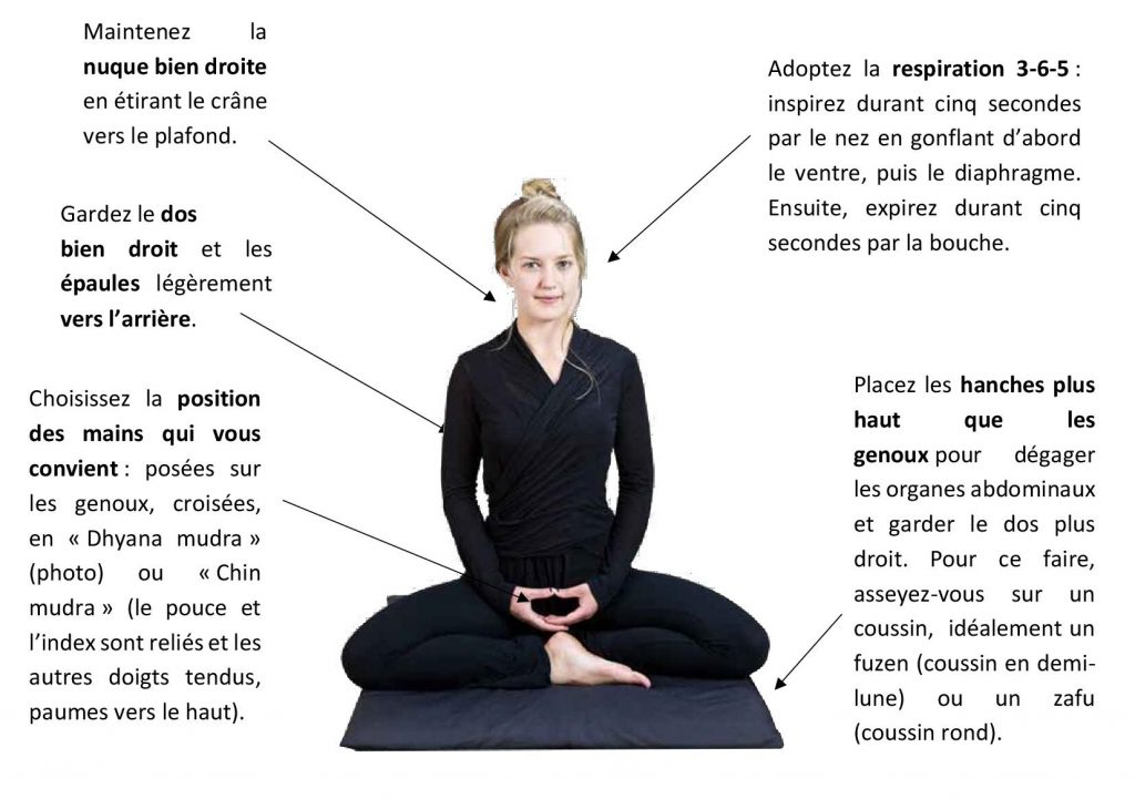La séance du matin s’effectue en position assise (en position birmane ou sur une chaise). En revanche, les séances intermédiaires peuvent se dérouler en marchant ou en position debout, si vous n’avez pas la possibilité d’adopter une posture plus adaptée.