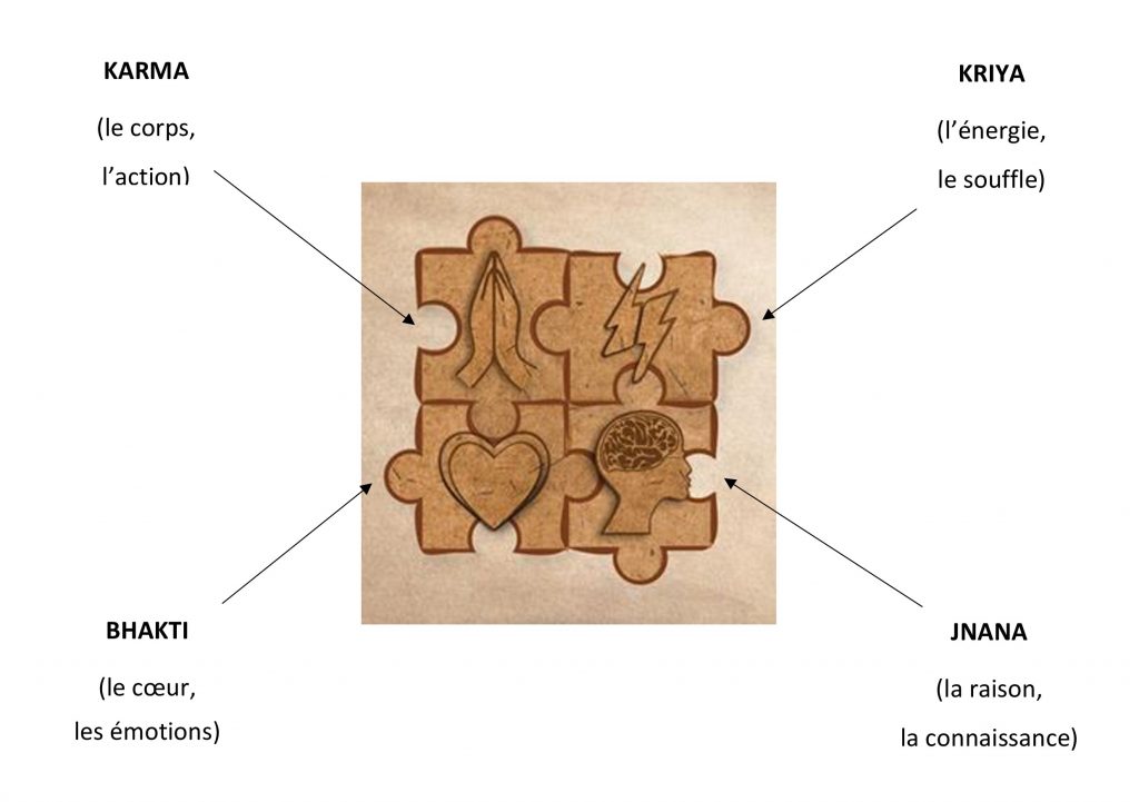 Le mot « yoga » vient du sanskrit et comporte la racine « yuj », qui signifie « unir, relier ». Mais de quoi le yoga est-il l’union ? Des éléments qui forment l’essence de notre existence, traduits en sanskrit par ces quatre mots : « Karma » (le corps, l’action), « Jnana » (la connaissance), « Bhakti » les émotions) et « Kriya » (l’énergie, le souffle).