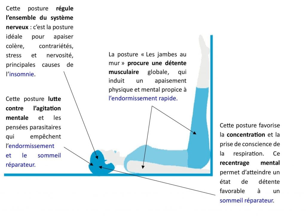 - Soulevez les pieds et posez-les contre le mur. Rapprochez les fesses jusqu’à les coller contre le mur. Les jambes sont jointes et tendues contre le mur. Votre corps doit former un angle droit.